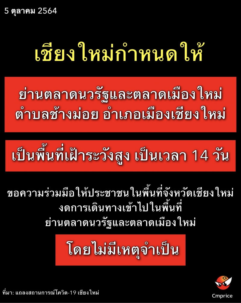เชียงใหม่ ประกาศให้ “พื้นที่ย่านตลาดนวรัฐและตลาดเมืองใหม่” เป็นพื้นที่เฝ้าระวังสูง ตั้งแต่วันที่ 5 - 18 ตุลาคม2564 หลังมีผู้ติดเชื้อแล้ว 50 ราย พร้อมขอความร่วมมือประชาชนงดการเดินทางเข้า-ออก พื้นที่ดังกล่าว และงดการจัดกิจกรรมรวมกลุ่ม เพื่อลดความเสี่ยงต่อการสัมผัสโรค