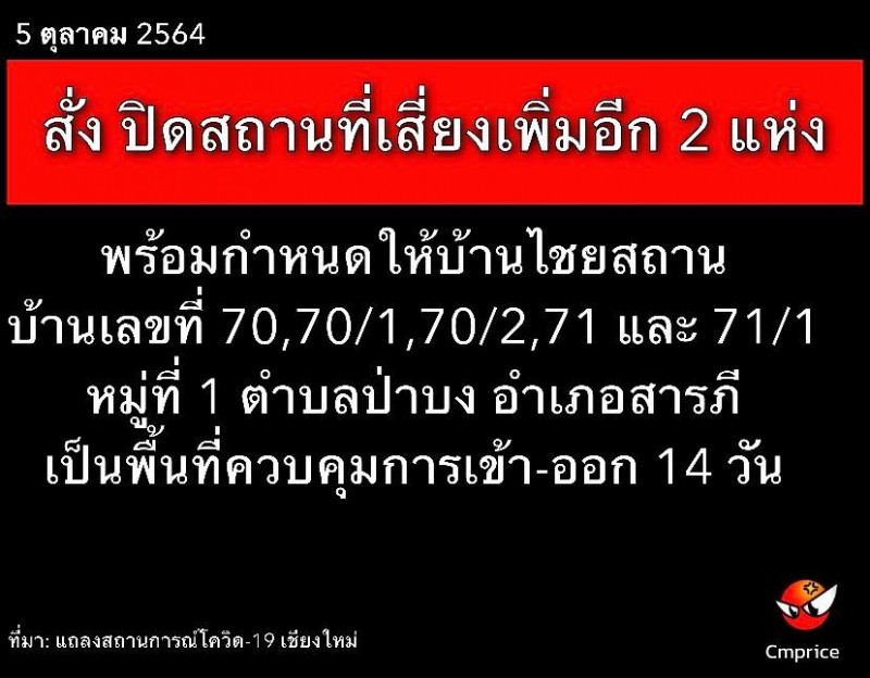 สั่ง ปิดสถานที่เสี่ยงเพิ่มอีก 2 แห่ง พร้อมกำหนดให้บ้านไชยสถาน หมู่ 1 อำเภอสารภี เป็นพื้นที่ควบคุมการเข้า-ออก 14 วัน