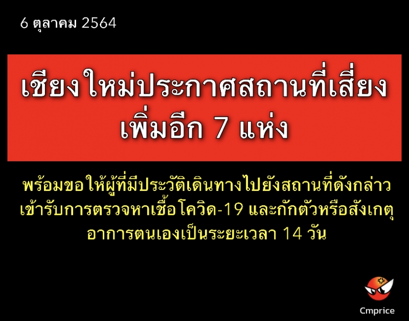 จังหวัดเชียงใหม่ประกาศสถานที่เสี่ยงเพิ่มอีก 7 แห่ง พร้อมขอให้ผู้ที่มีประวัติเดินทางไปยังสถานที่ดังกล่าวเข้ารับการตรวจหาเชื้อโควิด-19 และกักตัวหรือสังเกตุอาการตนเองเป็นระยะเวลา 14 วัน