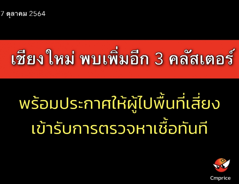 เชียงใหม่ พบเพิ่มอีก 3 คลัสเตอร์ พร้อมประกาศให้ผู้ไปพื้นที่เสี่ยง เข้ารับการตรวจหาเชื้อทันที