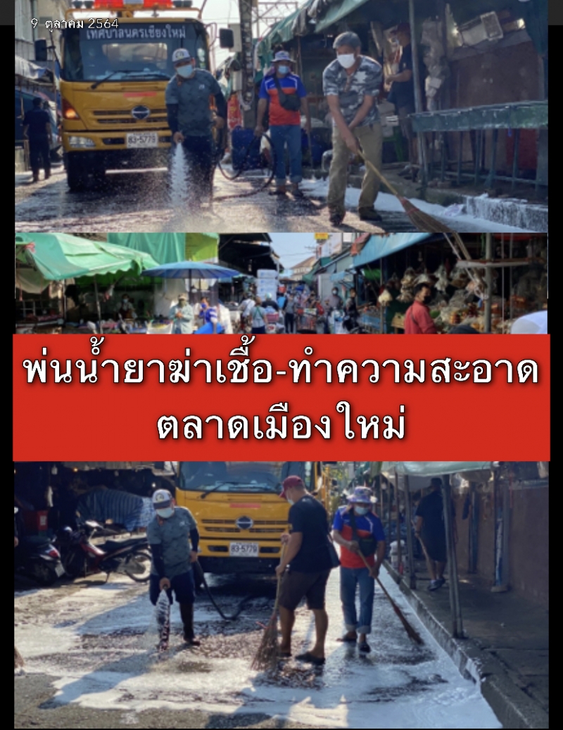 ศูนย์ปฏิบัติการควบคุมโรคเทศบาลนครเชียงใหม่ลงพื้นที่พ่นน้ำยาฆ่าเชื้อโรคและทำความสะอาดพื้นที่ย่านตลาดเมืองใหม่ เพื่อป้องกันการแพร่ระบาดของโรคโควิด-19 พร้อมขอความร่วมมืองดใช้สถานที่เสี่ยงเป็นการชั่วคราว