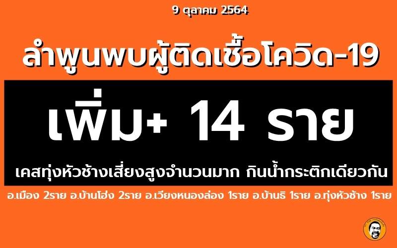 9 ตุลาคม 2564 ศูนย์ข่าวโควิด 19 ลำพูน ได้แถลง ลำพูนพบผู้ติดเชื้อเพิ่ม 14 ราย โดยเป็นการติดเชื้อในจังหวัด7ราย มาจากต่างจังหวัด7ราย