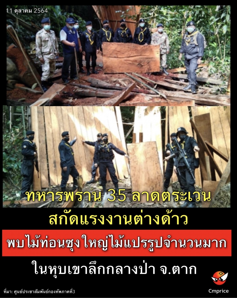 ทหารพราน 35 เดินเท้าลาดตระเวนสกัดแรงงานต่างด้าว ก่อนพบไม้ท่อนซุงใหญ่จำนวนมาก และไม้แปรรูปกว่า 341 แผ่น ในหุบเขาลึกกลางป่า จังหวัดตาก