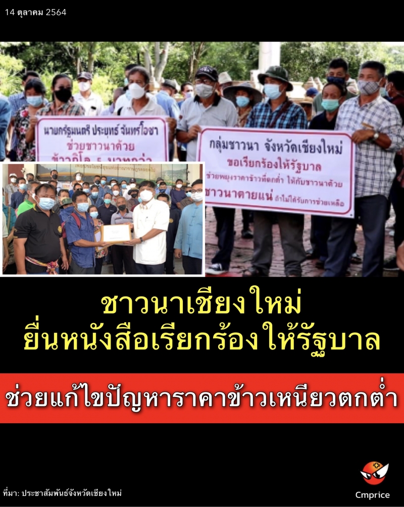 วันนี้ (14 ต.ค. 64) ที่ ศาลากลางจังหวัดเชียงใหม่ มีกลุ่มเกษตรกรชาวนากว่า 150 คน จาก 5 อำเภอในจังหวัดเชียงใหม่ ประกอบด้วย อำเภอแม่ริม  สันกำแพง สันป่าตอง  สันทราย และ อำเภอหางดง นำโดย นายนิมิต ขยัน ผู้ใหญ่บ้านวังปล้อง หมู่ 6  ตำบลเหมืองแก้ว  อำเภอแม่ริม  ได้รวมตัวกันมายื่นหนังสือถึงรัฐบาล ผ่านจังหวัดเชียงใหม่  เพื่อเรียกร้องให้รัฐบาลและกระทรวงพาณิชย์เร่งแก้ไขปัญหาและช่วยเหลือเกษตรกรชาวนาที่ได้รับความเดือดร้อนจากปัญหาราคาข้าวเหนียวตกต่ำ  โดยมี นายชัชวาลย์ ฉายะบุตร รองผู้ว่าราชการจังหวัดเชียงใหม่  พร้อมด้วย ผู้แทนจากสำนักงานพาณิชย์จังหวัดเชียงใหม่  เข้ามาเจรจาไกล่เกลี่ยและรับหนังสือคำร้องจากเกษตรกรในครั้งนี้