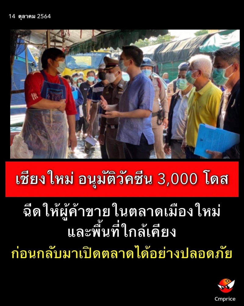 จังหวัดเชียงใหม่ อนุมัติวัคซีนจำนวน 3,000 โดส เพื่อฉีดให้แก่ผู้ค้าขายในตลาดเมืองใหม่และพื้นที่ใกล้เคียง สร้างความมั่นใจก่อนกลับมาเปิดตลาดได้อย่างปลอดภัย พร้อมขอความร่วมมือประชาชน ผู้ที่สัมผัส หรือมีความเสี่ยง ต้องกักตัวเองอย่างเคร่งครัด หากมีอาการผิดปกติให้เข้ารับการตรวจหาเชื้อทันที