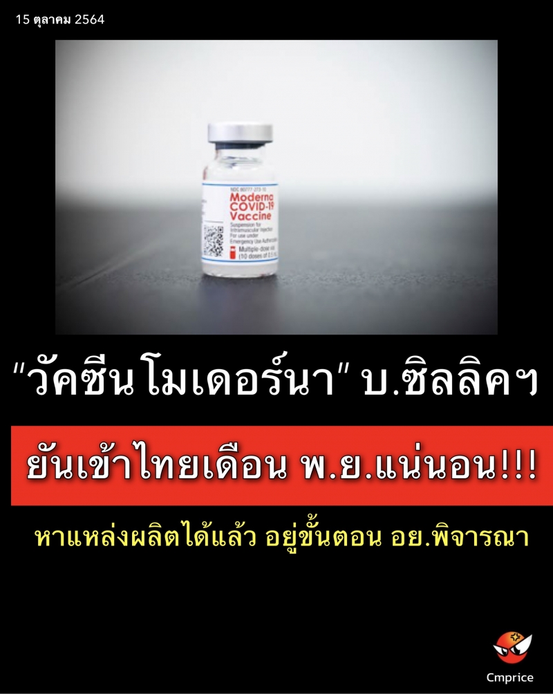 | • วัคซีนโมเดอร์นา บ.ซิลลิคฯ หาแหล่งผลิตได้แล้ว อยู่ขั้นตอน อย.พิจารณา ยันเข้าไทยเดือน พ.ย.แน่นอน!!! |