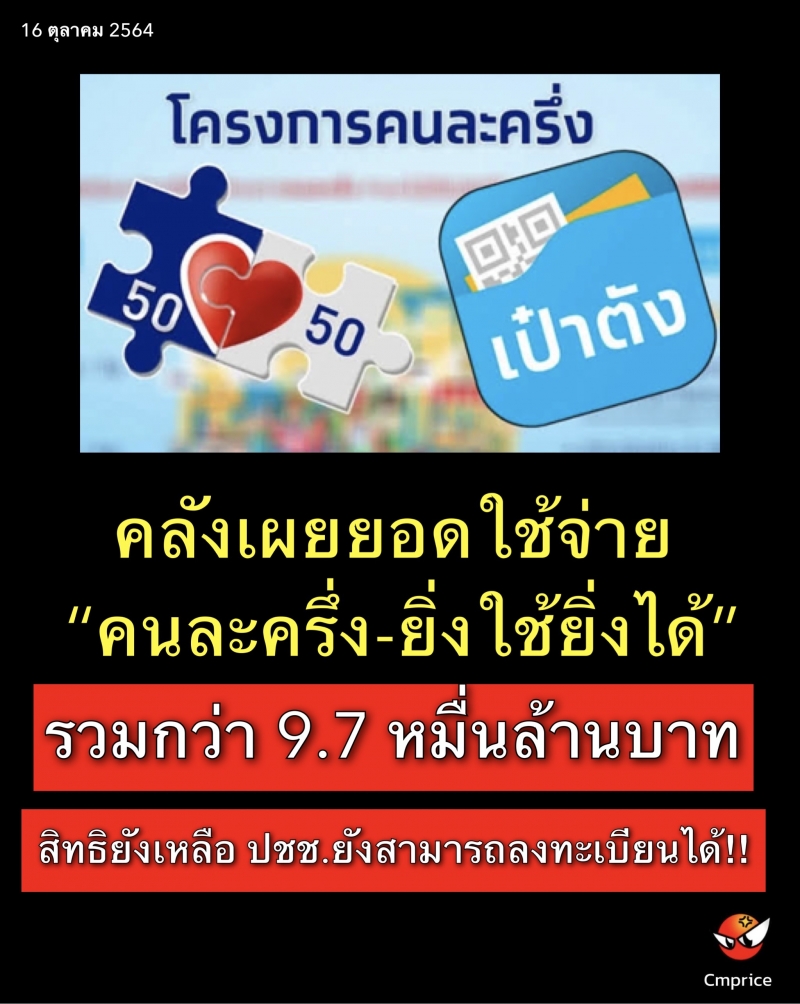 คลังเผยยอดใช้จ่าย “คนละครึ่ง-ยิ่งใช้ยิ่งได้” รวมกว่า 9.7 หมื่นล้านบาท ระบุ สิทธิยังเหลือ ปชช.ยังสามารถลงทะเบียนได้