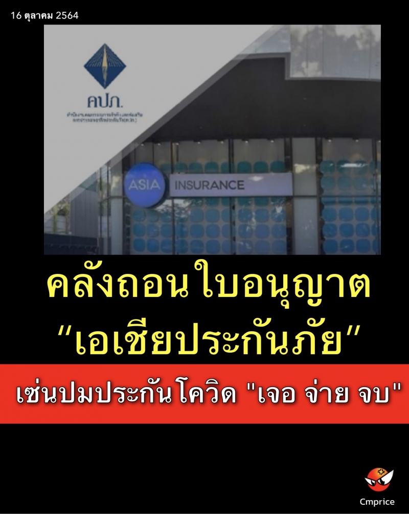 ดร. สุทธิพล ทวีชัยการ เลขาธิการคณะกรรมการกำกับและส่งเสริมการประกอบธุรกิจประกันภัย (เลขาธิการ คปภ.) แจ้งว่า รัฐมนตรีว่าการกระทรวงการคลัง มีคำสั่งกระทรวงการคลังที่ 1936/2564 ลงวันที่ 15 ตุลาคม 2564 ให้เพิกถอนใบอนุญาตประกอบธุรกิจประกันวินาศภัยบริษัท เอเชียประกันภัย 1950 จำกัด (มหาชน) โดยอาศัยอำนาจตามความในมาตรา 59 (1) (2) (4) และ (5) แห่งพระราชบัญญัติประกันวินาศภัย พ.ศ. 2535 และที่แก้ไขเพิ่มเติม ทั้งนี้ ตั้งแต่วันที่ 15 ตุลาคม 2564 เป็นต้นไป