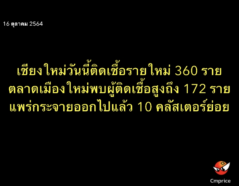สถานการณ์การระบาดโรค Covid-19 ของจังหวัดเชียงใหม่วันนี้ (16 ต.ค. 64) พบผู้ติดเชื้อรายใหม่เพิ่มขึ้น 360 รายเป็นผู้ติดเชื้อที่เดินทางจากต่างจังหวัด 7 ราย ประกอบด้วย กรุงเทพมหานคร 3 ราย นครปฐม 2 ราย ปทุมธานีและเชียงราย จังหวัดละ 1 ราย ส่วนผู้ติดเชื้ออีก 353 ราย เป็นผู้ติดเชื้อในจังหวัด โดยเป็นการสัมผัสจากผู้ติดเชื้อรายก่อนหน้า 23 ราย เป็นการระบาดในครอบครัวอีกหลายครอบครัวจำนวน 34 ราย อยู่ระหว่างการสอบสวนโรค 35 ราย และมาจากคลัสเตอร์ต่าง ๆ ซึ่งแยกเป็นคลัสเตอร์เดิม ที่อยู่ระหว่างการควบคุมโรค 56 ราย ซึ่งส่วนใหญ่อยู่ระหว่างการกักตัว จึงไม่มีผู้สัมผัสเพิ่ม อาทิ หอพักนักเรียนแบ๊ปติสท์ หมู่ 13 ตำบลยาเปียง อำเภออมก๋อย 11 ราย ,ชุมชนหลังวัดป่าเป้า ซอยอุ่นอารีย์ ตำบลศรีภูมิ 8 ราย ,หมู่ 8 ตำบลหางดง อำเภอฮอด 6 ราย ,งานวันเกิด หมู่ 6 ตำบลท่าผา อำเภอแม่แจ่ม 4 ราย ,โรงน้ำดื่มพีเอ็น โรงลูกชิ้นพรสวรรค์ และหอพักเจ๊พร หมู่ 9 ตำบลต้นเปา 4 ราย นอกนั้นพบแห่งละ 1-3 รายจากหลายคลัสเตอร์