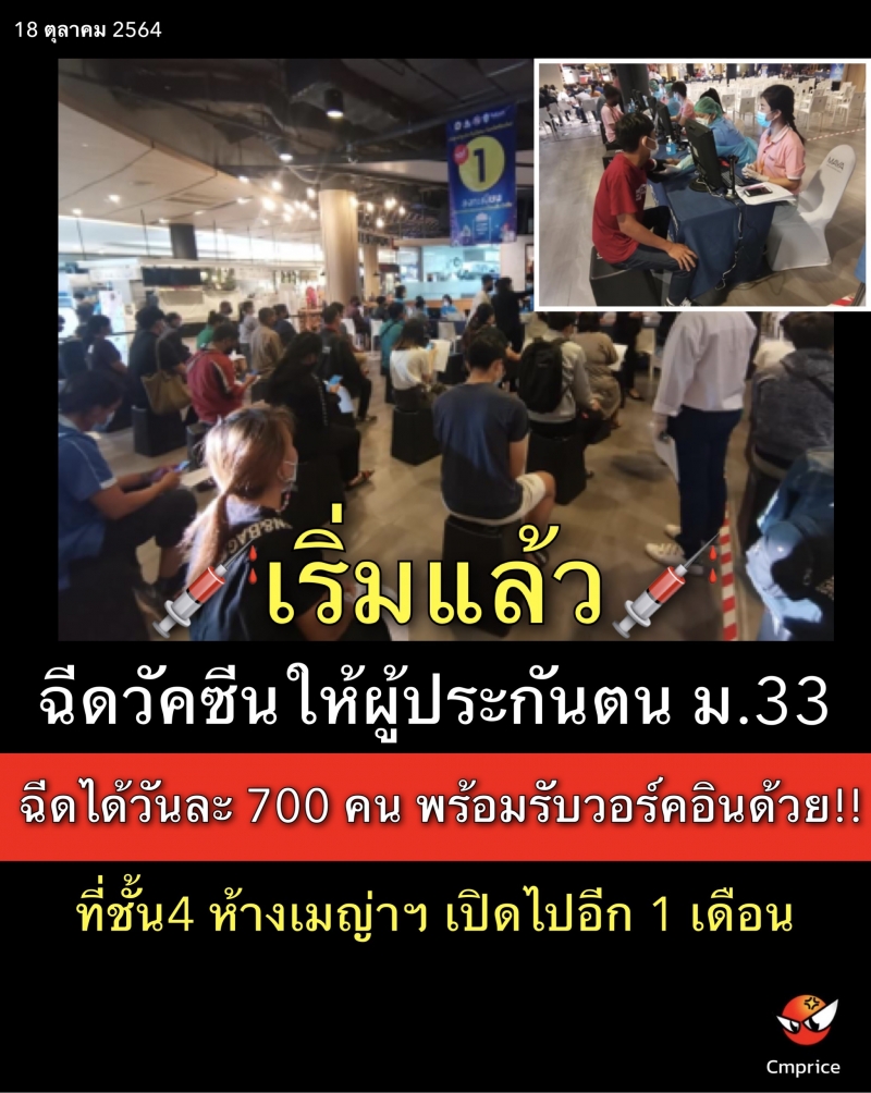 วันที่ 18 ต.ค. 64 บริเวณชั้น 4 ศูนย์การค้าเมญ่า ไลฟ์ไตล์ ช้อปปิ้ง เซ็นเตอร์ นายประจญ ปรัชญ์สกุล ผู้ว่าราชการจังหวัดเชียงใหม่ ตรวจเยี่ยมจัดให้บริการฉีดวัคซีนโควิด-19 ให้กลุ่มผู้ประกันตนที่อยู่ในระบบประกันสังคมมาตรา 33 ซึ่งสำนักงานประกันสังคมจังหวัดเชียงใหม่ได้รับการจัดสรรวัคซีนมาฉีดให้แก่ผู้ประกันตนจำนวน 10,000 โดส โดยเริ่มฉีดวันนี้เป็นวันแรกโดยจะเปิดให้บริการที่ห้างเมญ่าฯ ไปอีก 1 เดือน ซึ่งผู้ประกันตนที่ประสงค์จะฉีดวัคซีนสามารถลงทะเบียนได้ที่เว็บไซต์ของสำนักงานประกันสังคม หรือผู้ที่มีสิทธิตามเกณฑ์ของสำนักงานประกันสังคมสามารถวอร์คอินเข้ารับการฉีดวัคซีนโควิด-19 ได้