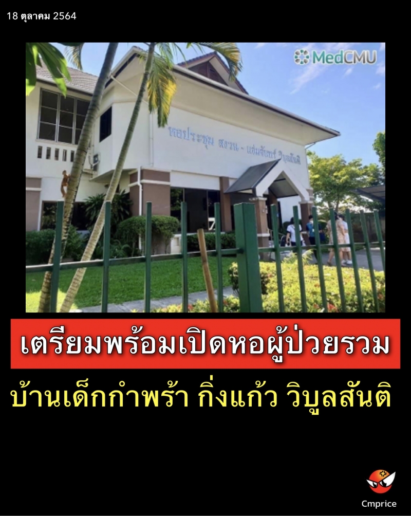 ผศ.นพ.นเรนทร์ โชติรสนิรมิต ผู้อำนวยการ และดร.หรรษา เทียนทอง รองผู้อำนวยการ โรงพยาบาลมหาราชนครเชียงใหม่ พร้อมคณะ เข้าตรวจเยี่ยมสถานที่ มูลนิธิ บ้านเด็กกำพร้า กิ่งแก้ว วิบูลสันติ เพื่อประเมินแนวทางการดำเนินงานในการจัดตั้งหอผู้ป่วยรวม (cohort ward) จากกรณีที่ มูลนิธิบ้านเด็กกำพร้า กิ่งแก้ว วิบูลสันติ มีเด็กในความดูแล ติดเชื้อโควิด-19 อยู่จำนวนหนึ่ง โดยมี พยาบาลควบคุมโรคติดเชื้อ , หัวหน้างานการพยาบาลกุมารเวชศาสตร์ , บริการกลางโรงพยาบาล ,ผู้ตรวจการ ,หัวหน้าศูนย์สร้างเสริมสุขภาพ , บุคลากรจากงานเวชระเบียน ร่วมเข้าสำรวจความพร้อมในการจัดตั้ง เมื่อวันที่ 17 ตุลาคม 2564 ระหว่างเวลา 18.00-20.00 น.
