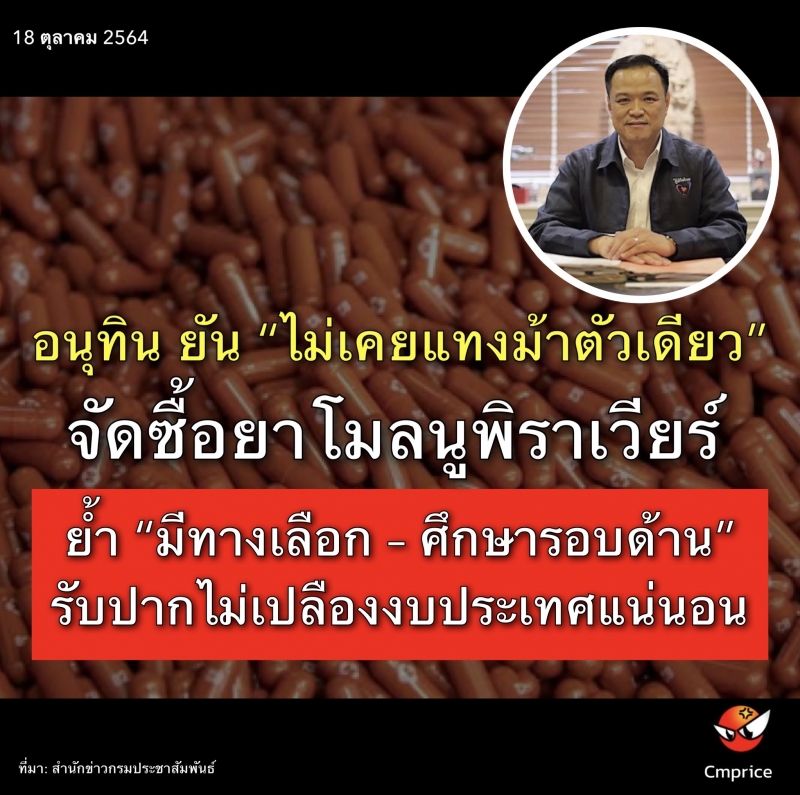 | • อนุทิน ยัน ไม่เคยแทงม้าตัวเดียว จัดซื้อยาโมลนูพิราเวียร์ ย้ำ มีทางเลือก ศึกษารอบด้าน รับปากไม่เปลืองงบประเทศแน่นอน |