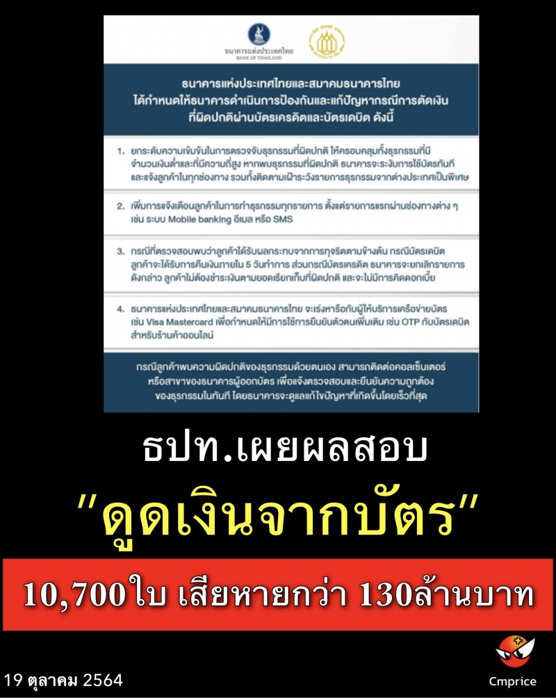 ตามที่ แบงก์ชาติและสมาคมธนาคารไทย ได้ชี้แจงกรณีการตัดเงินที่ผิดปกติ ผ่านบัตรเครดิตและบัตรเดบิตของลูกค้าจำนวนมาก เมื่อวันที่ 17 ตุลาคม ที่ผ่านมา ว่ามิได้เกิดจากการรั่วไหลของข้อมูลจากระบบธนาคาร โดยสาเหตุสำคัญเกิดจากการที่มิจฉาชีพสุ่มข้อมูลบัตรและนำไปสวมรอยทำธุรกรรมผ่านร้านค้าออนไลน์ต่างประเทศ ที่ไม่มีการใช้ One Time Password (OTP) โดยตั้งแต่ต้นเดือนตุลาคม มีบัตรที่มีการใช้งานผิดปกติจากเหตุข้างต้นจำนวน 10,700 ใบ คิดเป็นมูลค่ากว่า 130 ล้านบาท ส่วนใหญ่เป็นการตัดเงินจากบัตรเดบิต และกว่า 90% มาจากการทำธุรกรรมชำระค่าสินค้าและบริการกับร้านค้าออนไลน์ที่อยู่ในต่างประเทศเป็นหลัก ไม่ได้เกิดจากการรั่วไหลของข้อมูลจากธนาคารพาณิชย์เจ้าของบัญชี