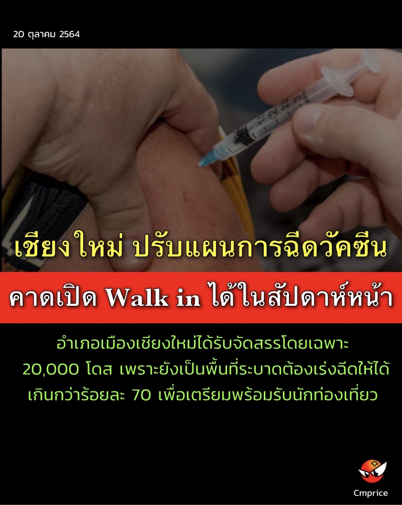 เชียงใหม่ ปรับแผนการฉีดวัคซีน รองรับวัคซีนที่จะได้รับจัดสรรเพิ่มเติม คาดจะสามารถเปิด Walk in ได้ในสัปดาห์หน้า