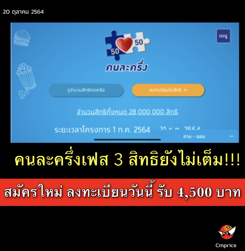 คนละครึ่งเฟส 3 สิทธิยังไม่เต็ม สมัครใหม่ ลงทะเบียนวันนี้ รับ 4,500 บาท