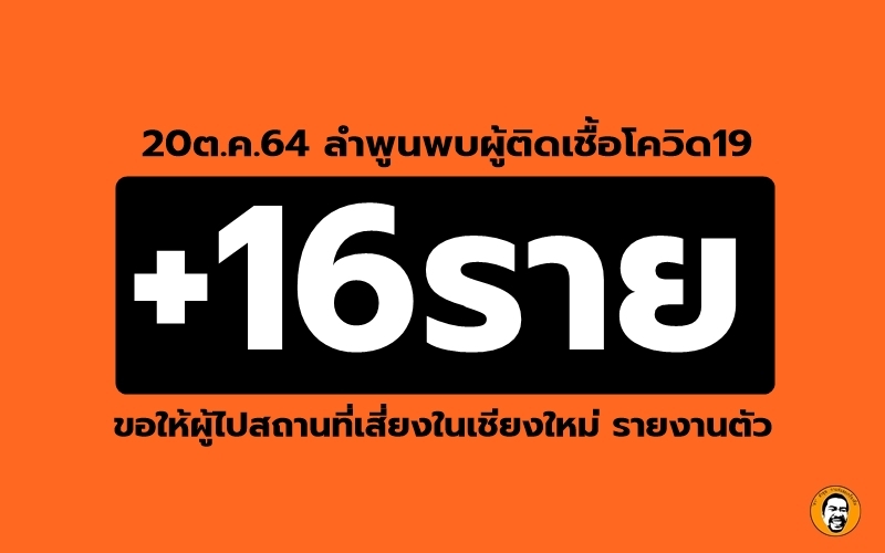 20ตุลาคม64 ศูนย์ข่าวโควิด 19 ลำพูน ได้แถลง ลำพูนพบผู้ติดเชื้อเพิ่ม 16ราย เป็นการติดเชื้อในจังหวัด9ราย มาจากต่างจังหวัด 7ราย (ดูและฟังแถลง ได้ข้างล่าง )