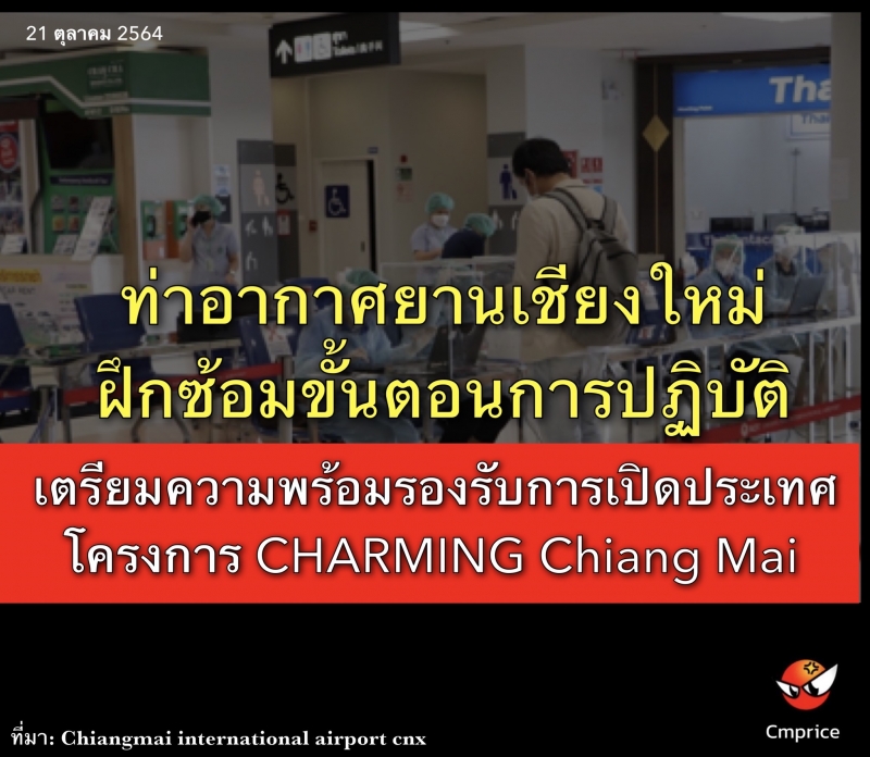วันที่ 21 ตุลาคม 2564 นายวิจิตต์ แก้วไทรเทียม ผู้อำนวยการท่าอากาศยานเชียงใหม่ เป็นประธานการฝึกซ้อมขั้นตอนการปฏิบัติเพื่อเตรียมความพร้อมรองรับการเปิดประเทศ และการเปิดให้บริการเที่ยวบินระหว่างประเทศ ตามโครงการ CHARMING Chiang Mai ณ ห้องประชุมอาคารสำนักงานท่าอากาศยานเชียงใหม่ โดยมีผู้บริหารท่าอากาศยานเชียงใหม่ ผู้แทนส่วนราชการ อาทิ ด่านตรวจคนเข้าเมือง ด่านควบคุมโรคติดต่อระหว่างประเทศ ด่านศุลกากร ผู้แทนสายการบินและผู้ให้บริการภาคพื้น ตลอดจนคณะกรรมการอำนวยความสะดวกและรักษาความปลอดภัยของท่าอากาศยานเชียงใหม่ เข้าร่วมประชุมผ่านระบบออนไลน์ อย่างพร้อมเพรียง