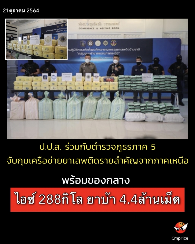 วันนี้ (วันที่ 21 ตุลาคม 2564) เวลา 13.00 น. นายวิชัย ไชยมงคล เลขาธิการ ป.ป.ส. พล.ต.ท.ปิยะ ต๊ะวิชัย ผู้บัญชาการตำรวจภูธรภาค 5 และ พล.ท.วัฒนะ พลจันทร์ ผู้บัญชาการศูนย์รักษาความปลอดภัย กองบัญชาการกองทัพไทย แถลงข่าวจับกุมผู้ต้องหา 2 ราย พร้อมของกลาง ไอซ์ 288 กิโลกรัม ยาบ้า 4.4
