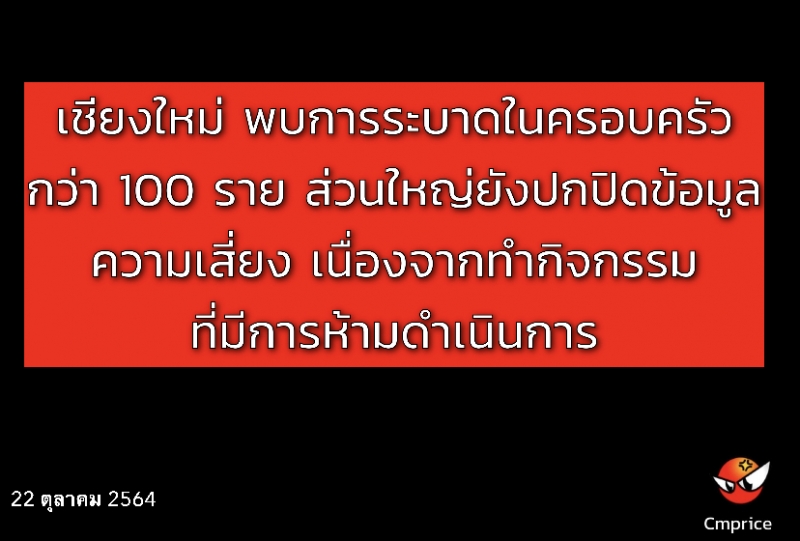 เชียงใหม่ พบการระบาดในครอบครัวกว่า 100 ราย ส่วนใหญ่ยังปกปิดข้อมูลความเสี่ยง เนื่องจากทำกิจกรรมที่มีการห้ามดำเนินการ