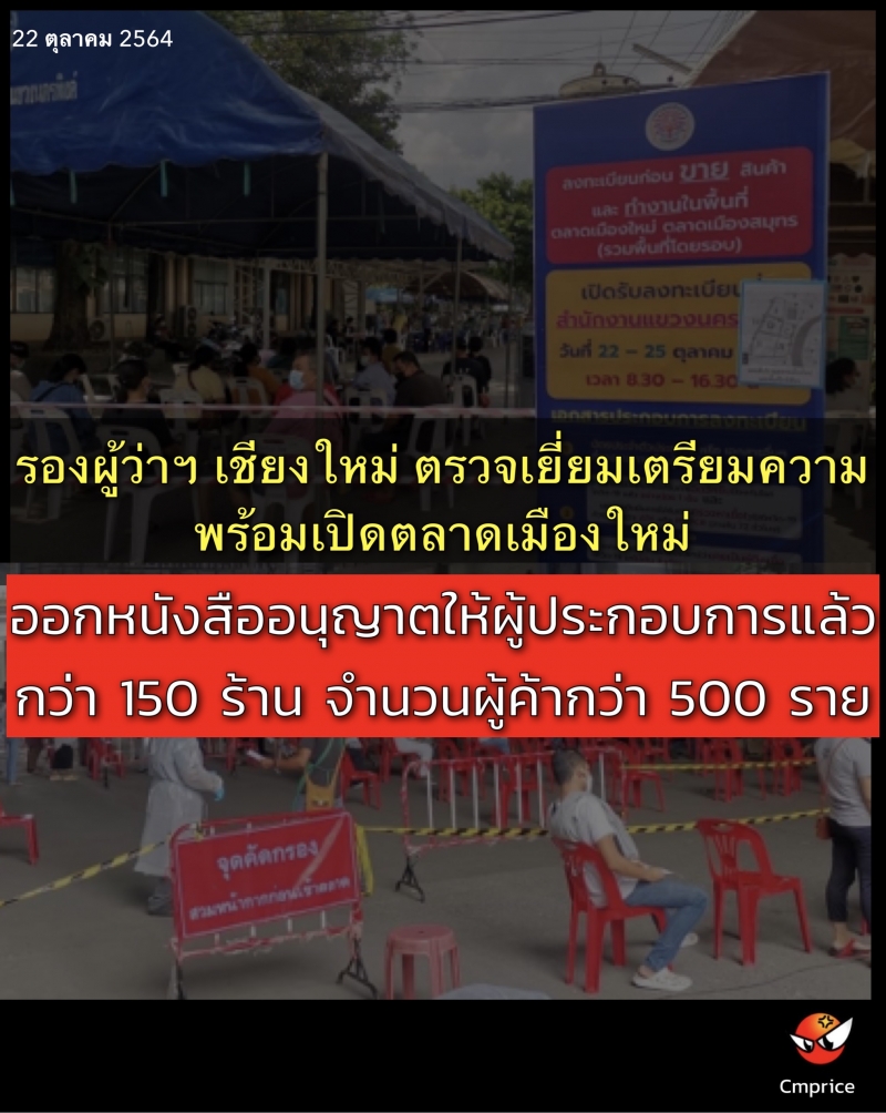 รองผู้ว่าฯ เชียงใหม่ ตรวจเยี่ยมการเตรียมความพร้อมเปิดตลาดเมืองใหม่ ซึ่งตั้งแต่ช่วงเช้าที่ผ่านมาสามารถออกหนังสืออนุญาตให้แก่ผู้ประกอบการไปแล้วกว่า 150 ร้าน จำนวนผู้ค้ากว่า 500 ราย