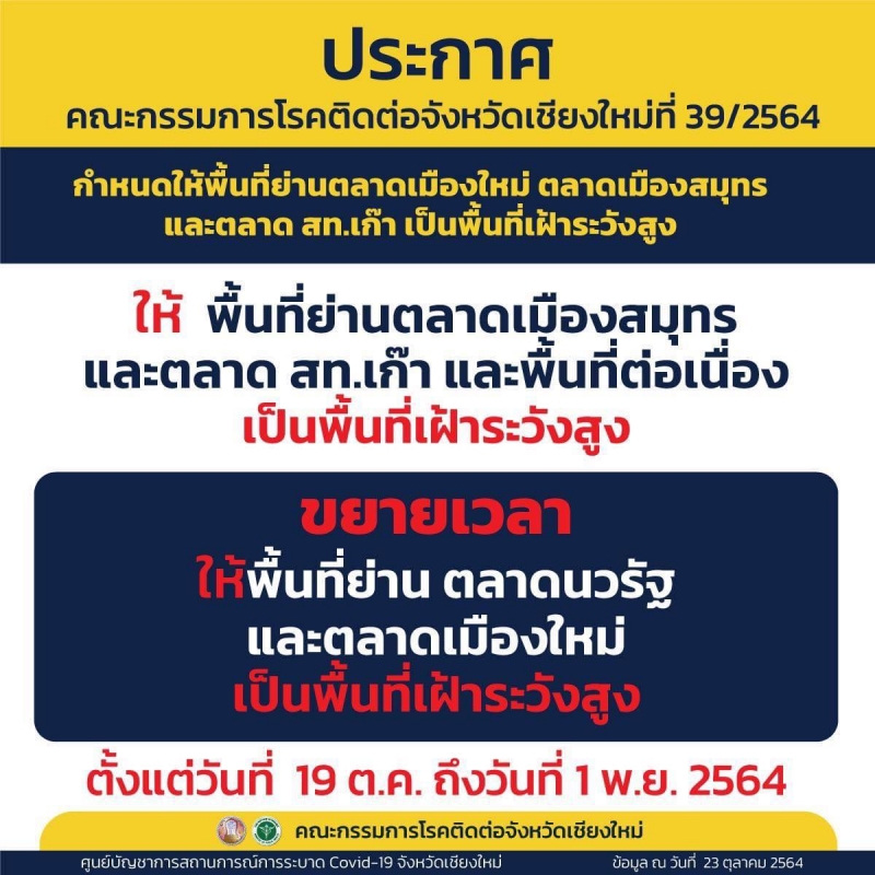 ประกาศคณะกรรมการโรคติดต่อจังหวัดเชียงใหม่(ฉบับที่ ๓๙) กำหนดให้พื้นที่ย่านตลาดนวรัฐ ตลาดเมืองใหม่ ตลาดเมืองสมุทร และตลาด สท.เก๊า