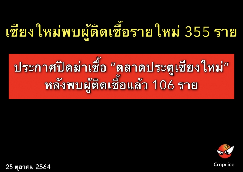 จังหวัดเชียงใหม่ ประกาศปิดฆ่าเชื้อ “ตลาดประตูเชียงใหม่” 26-28 ตุลาคม ย้ำผู้ที่จะกลับมาเปิดค้าขายได้นั้น ต้อง มีผลโควิดเป็นลบภายใน 3 วัน และฉีดวัคซีนแล้วอย่างน้อย 1 เข็ม พร้อมเฝ้าระวังคลัสเตอร์ตลาดเมืองใหม่อย่างต่อเนื่อง ภายหลังพบว่ามีการแพร่ระบาดไปยังชุมชนแรงงานต่างด้าว