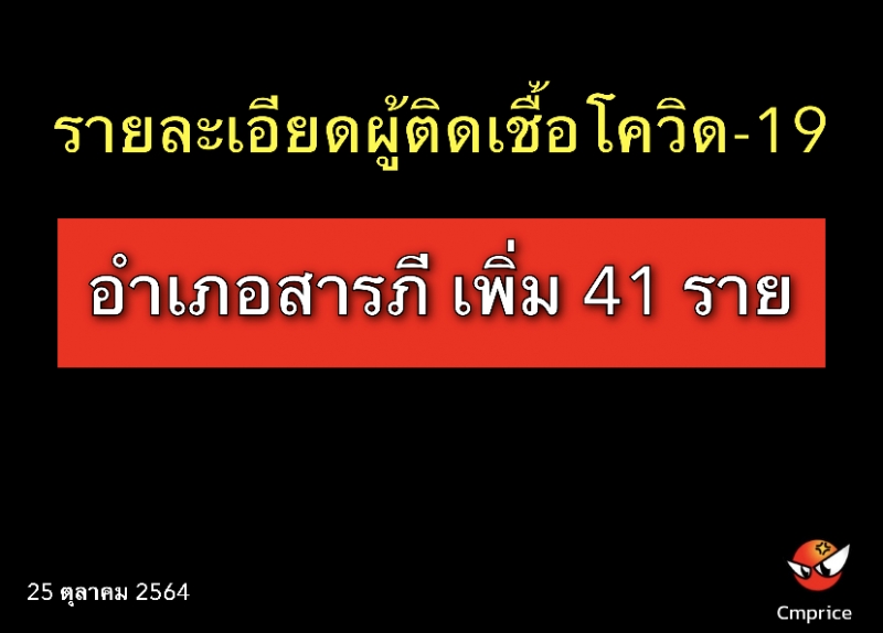 25 ตุลาคม 2564 งานควบคุมโรคติดต่อ สสอ.สารภี รายงานสถานการณ์โรคติดเชื้อไวรัสโคโรนา 2019 (COVID - 19) อำเภอสารภี เพิ่ม + 41 ราย -CM14468 ม.6 ต.หนองผึ้ง สัมผัสพื้นที่การระบาดจากต่างจังหวัด **จ.สระบุรี**