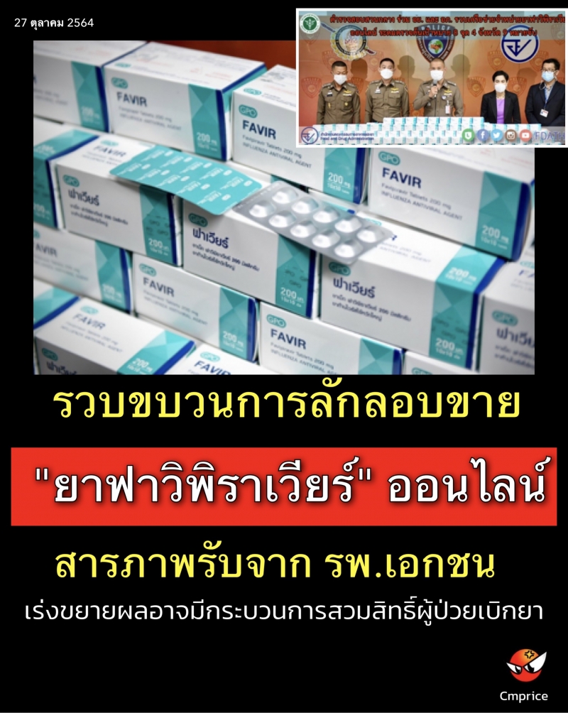รวบขบวนการลักลอบขาย "ยาฟาวิพิราเวียร์" ออนไลน์ พร้อมยึดของกลาง สารภาพรับจาก รพ.เอกชน เร่งขยายผล อาจมีกระบวนการสวมสิทธิ์ผู้ป่วยเบิกยา