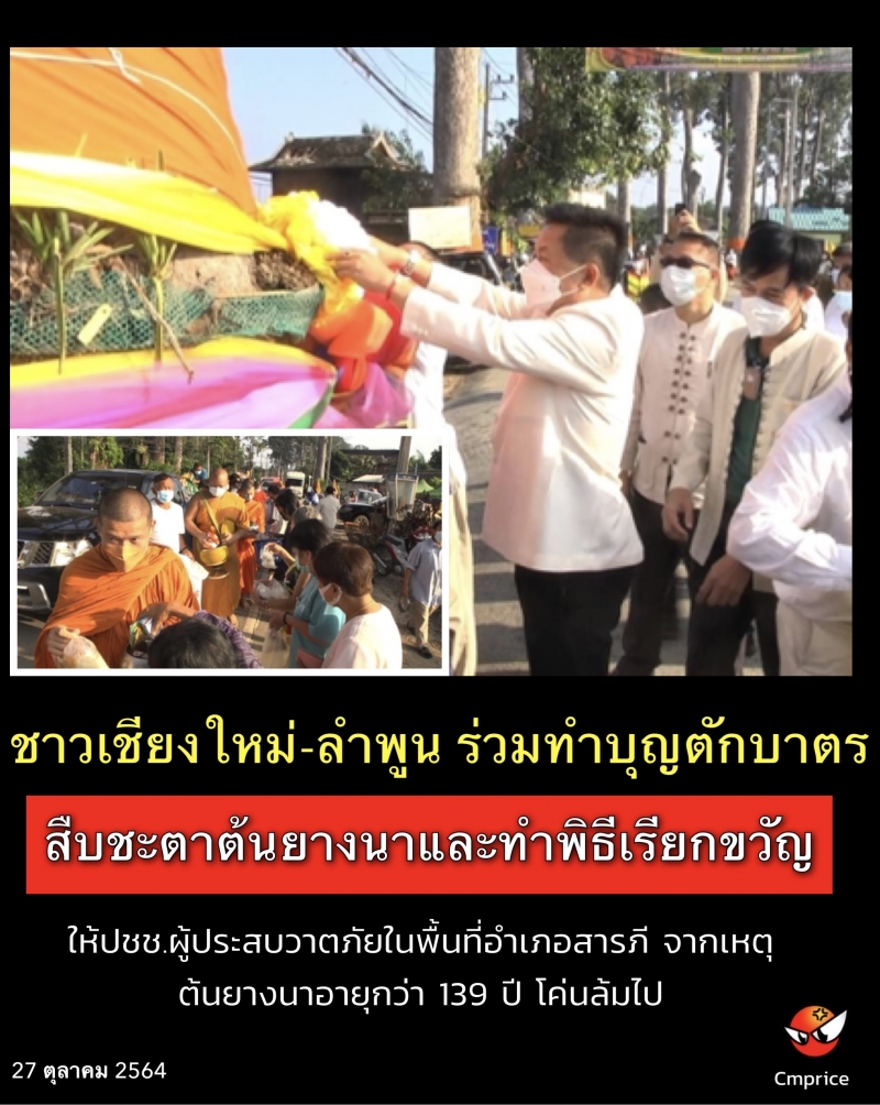 ชาวเชียงใหม่-ลำพูน ร่วมทำบุญตักบาตร สืบชะตาต้นยางนาและทำพิธีเรียกขวัญให้ประชาชนผู้ประสบวาตภัยในพื้นที่อำเภอสารภี จากเหตุต้นยางนาอายุกว่า 139 ปี โค่นล้ม