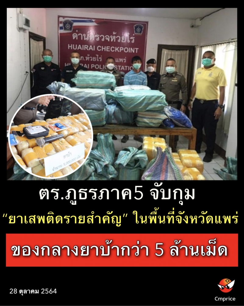ตำรวจภูธรภาค5 จับกุมยาเสพติดรายสำคัญ พร้อมของกลางยาบ้ากว่า 5 ล้านเม็ด ในพื้นที่จังหวัดแพร่