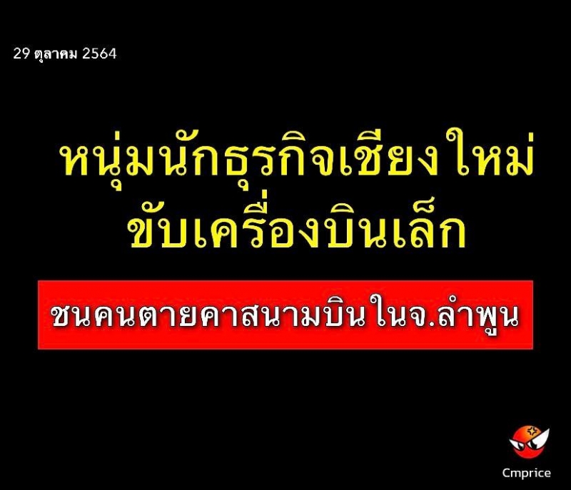 (29 ต.ค. 64) พล.ต.ท.ปิยะ ต๊ะวิชัย ผบช.ภ.5 ได้รับรายงานจาก พล.ต.ต.มงคล สัมภวะผล ผบก.ภ.จว.ลำพูน รายงานกรณีหนุ่มนักธุรกิจดัง ขับเครื่องบินเล็กชนคนเสียชีวิต โดยเหตุดังกล่าวเกิดขึ้นเมื่อเวลา 20.00 น. วันที่ 28 ต.ค.64 ซึ่ง พ.ต.อ.สามพราน จันทร์มั่งคั่ง ผกก.สภ.เหมืองจี้ ได้รับแจ้งเหตุดังกล่าวแล้วจึงได้ประสานพนักงานสอบสวนสภ.เหมืองจี้ จ.ลำพูน