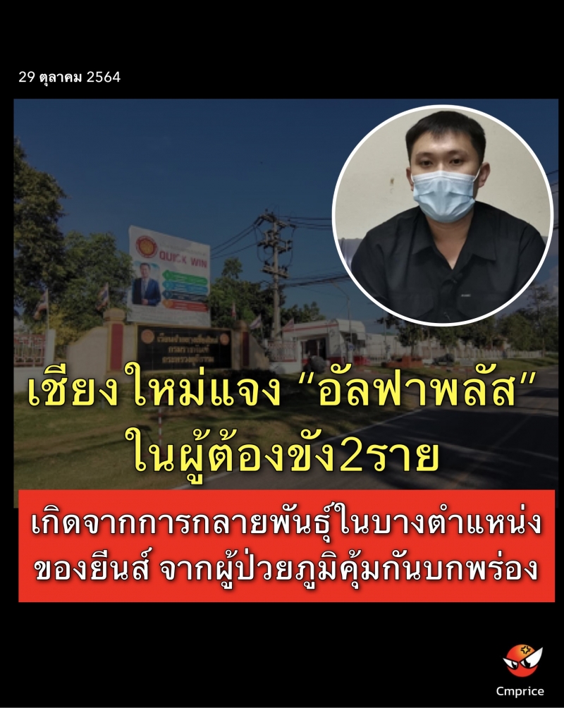 | • เชียงใหม่แจง อัลฟาพลัสที่พบในเรือนจำกลางเชียงใหม่ เกิดจากการกลายพันธุ์ในบางตำแหน่งของยีนส์ พบภายในพื้นที่ จากผู้ป่วยภูมิคุ้มกันบกพร่อง |