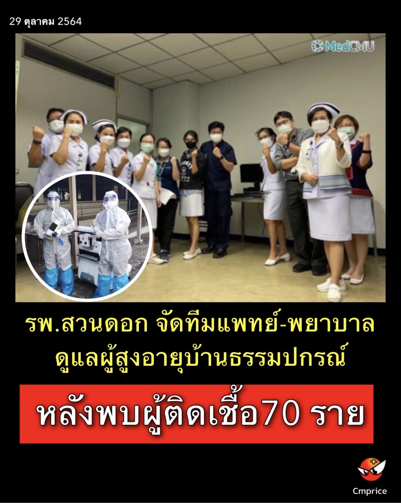 | • ทีมแพทย์และพยาบาล รพ.สวนดอก จัดทีมพยาบาลช่วยผู้สูงอายุบ้านธรรมปกรณ์ หลังพบผู้ติดเชื้อ70 ราย |