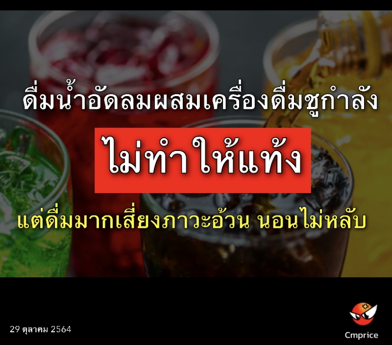| • กรมอนามัย เผย ดื่มน้ำอัดลมผสมเครื่องดื่มชูกำลัง ไม่ทำให้แท้ง แต่ดื่มมากกลับเสี่ยงภาวะอ้วน นอนไม่หลับ |