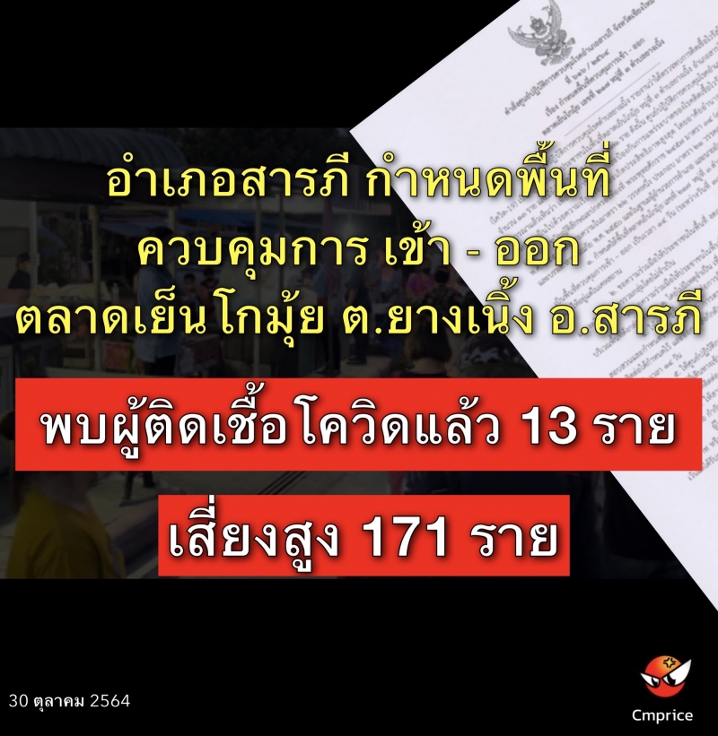 อำเภอสารภี กำหนดพื้นที่ควบคุมการ เข้า - ออก ตลาดเย็นโกมุ้ย เลขที่ 217 หมู่ที่ 3 ตำบลยางเนิ้ง เป็นเวลา 14 วัน (30 ตุลาคม 2564 - 13 พฤศจิกายน 2564) หลังพบการติดเชื้อโควิดเป็นกลุ่มก้อนของประชาชนในพื้นที่ตลาดเย็นโกมุ้ย