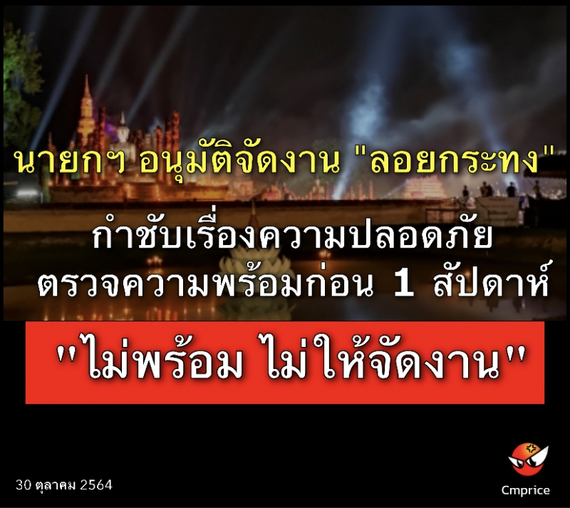 | • นายกฯ อนุมัติจัดงาน "ลอยกระทง" กำชับเรื่องความปลอดภัย ตรวจความพร้อมก่อน 1 สัปดาห์ "ไม่พร้อม ไม่ให้จัดงาน" |