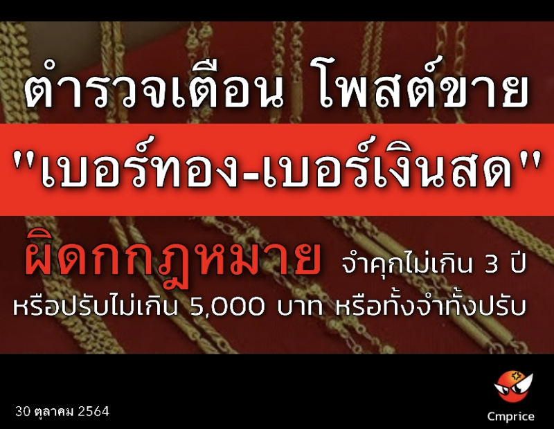 | • ตำรวจเตือน โพสต์ขาย "เบอร์ทอง-เบอร์เงินสด" เข้าข่ายผิดกกฎหมายจำคุกไม่เกิน 3 ปี หรือปรับไม่เกิน 5,000 บาท หรือทั้งจำทั้งปรับ |