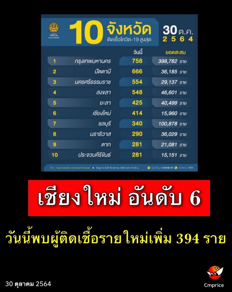 เชียงใหม่ มีผู้ติดเชื้อเพิ่ม 394ราย อันดับ6ของประเทศ