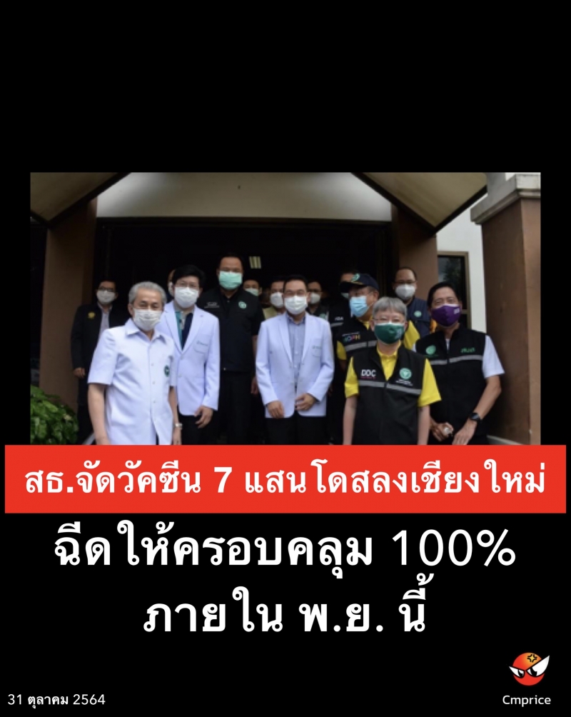 รองนายกรัฐมนตรีและรัฐมนตรีว่าการกระทรวงสาธารณสุข ติดตามมาตรการป้องกันควบคุมโรคโควิด 19 จ.เชียงใหม่ ย้ำ 3 ปัจจัยความสำเร็จ UP ตรวจ ATK และฉีดวัคซีนให้ครอบคลุม 100% พร้อมสนับสนุนวัคซีนอีก 7 แสนโดส ฉีดให้ครอบคลุมทั้งจังหวัด รวมถึงกลุ่มต่างชาติ ชนเผ่า ภายในเดือนพฤศจิกายนนี้ ให้เพิ่มการจัดทำ Covid Free Setting เพื่อสร้างความมั่นคงปลอดภัย รองรับการเปิดประเทศ