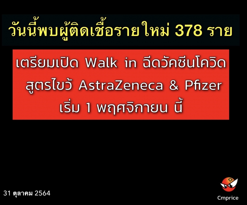 จังหวัดเชียงใหม่ เตรียมเปิด Walk in ฉีดวัคซีนป้องกันโรคโควิด-19 สูตรไขว้ AstraZeneca & Pfizer ให้แก่ผู้ที่ยังไม่เคยได้ฉีดวัคซีนป้องกันโรคโควิด-19 มาก่อน และมีภูมิลำเนาอยู่ในจังหวัดเชียงใหม่ โดยเริ่มตั้งแต่วันที่ 1 พฤศจิกายนเป็นต้นไป