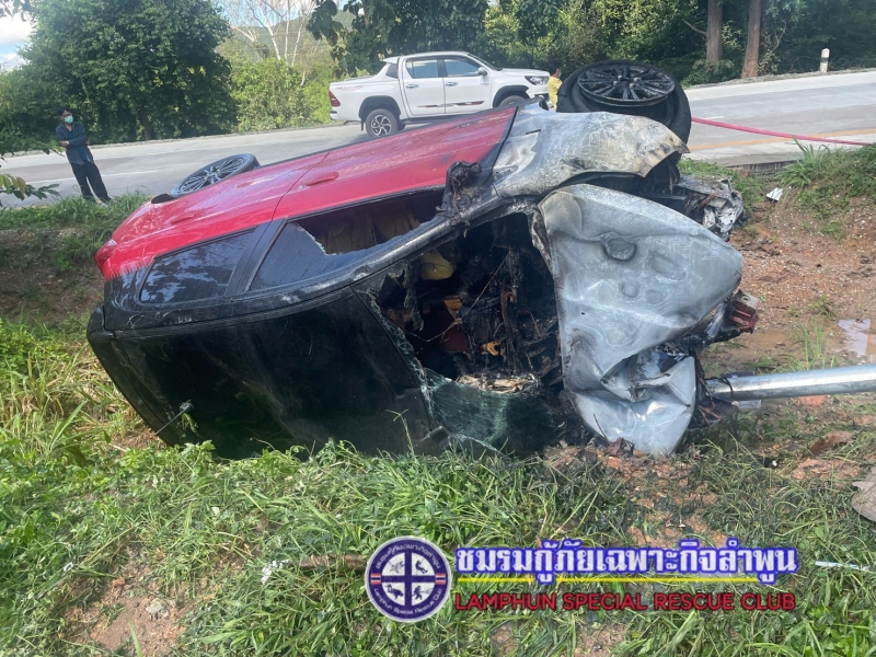 เมื่อเวลาประมาณ 10.45น. เกิดเหตุ  รถเก๋ง เสียหลัก พุ่งลงเกาะกลางถนน ชนเสาไฟ แล้วเกิดเหตุเพลิงลุดไหม้ ตัวรถ