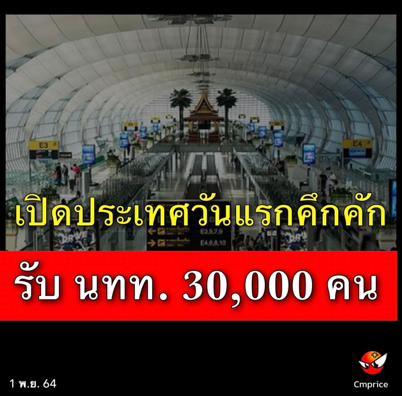 เปิดประเทศวันแรกคึกคัก สุวรรณภูมิรับ 61 ไฟลท์ 6 ท่าอากาศยานรับ 110 ไฟลท์ คาดมี นทท.ประมาณ 30,000 คน ใช้มาตรการเข้มสกัดโควิด-19