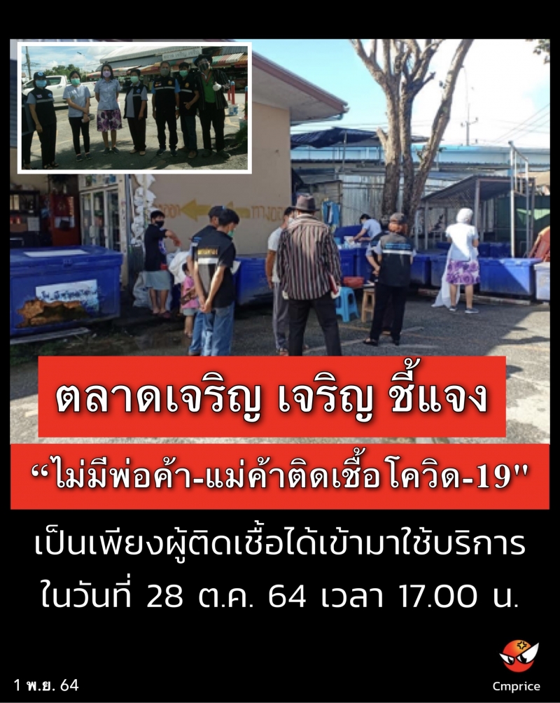 เนื่องจากมีการเผยแพร่ไทม์ไลน์ของตลาดเจริญ เจริญ เมื่อวันที่ 31 ตุลาคม 2564 ที่ผ่านมา ว่าพบผู้ติดเชื้อในตลาดของเรา ทางตลาดขอใช้พื้นที่ตรงนี้เพื่อชี้แจงนะคะ จากการตรวจสอบพบว่ามีผู้ติดเชื้อได้เข้ามาใช้บริการในวันที่ 28 ตุลาคม 2564 เวลา 17.00 น. ณ ร้านน้ำแข็งของตลาดค่ะ โดยวันนี้ทางสาธารณสุขได้เข้ามาทำการ Swarp บุคคลในร้านเพื่อตรวจหาเชื้อโควิด-19ทุกคน ผลปรากฏว่า ทุกคนมีผลตรวจเป็นลบ ทั้งนี้ทางสธ.ได้ยืนยันว่า " ทางตลาดเจริญเจริญ ยังไม่มีพ่อค้าแม่ค้าคนใดติดเชื้อโควิด-19" ทั้งนี้ทางตลาดก็มิได้นิ่งนอนใจและเป็นห่วงในความปลอดภัยของผู้ค้าและลูกค้าทุกท่านที่มาใช้บริการตลาด จึงจะทำการล้างตลาดใหญ่(BIG CLEANING) และพ่นน้ำยาฆ่าเชื้อโควิดทั้งตลาดในวันอังคารที่ 2 พ.ย.64 เวลา 7.00-12.00 น. นอกจากนี้ ทางตลาดยังคงมาตรการของทางสาธารณสุขในการควบคุมการระบาดอย่างเข้มงวด โดยจัดให้มีการฉีดพ่นน้ำยาฆ่าเชื้อภายในตลาดทุกๆชั่วโมง มีการวัดอุณหภูมิ มีเจลแอลกอฮอล์ล้างมือ ทุกคนต้องสวมหน้ากากอนามัยตลอดเวลา ฯลฯ ทั้งนี้เพื่อความปลอดภัยของลูกค้าทุกคนที่มาใช้บริการตลาด เราผ่านวิกฤตครั้งนี้ไปได้ด้วยกันนะคะ