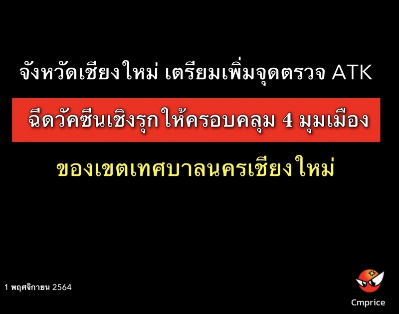 จังหวัดเชียงใหม่ เตรียมเพิ่มจุดตรวจ ATK และฉีดวัคซีนเชิงรุกให้ครอบคลุม 4 มุมเมืองของเขตเทศบาลนครเชียงใหม่ เป็นระยะเวลา 14 วัน โดยเริ่ม 4 พฤศจิกายนนี้ เพื่อเร่งคืนความปลอดภัยให้กับชาวเชียงใหม่