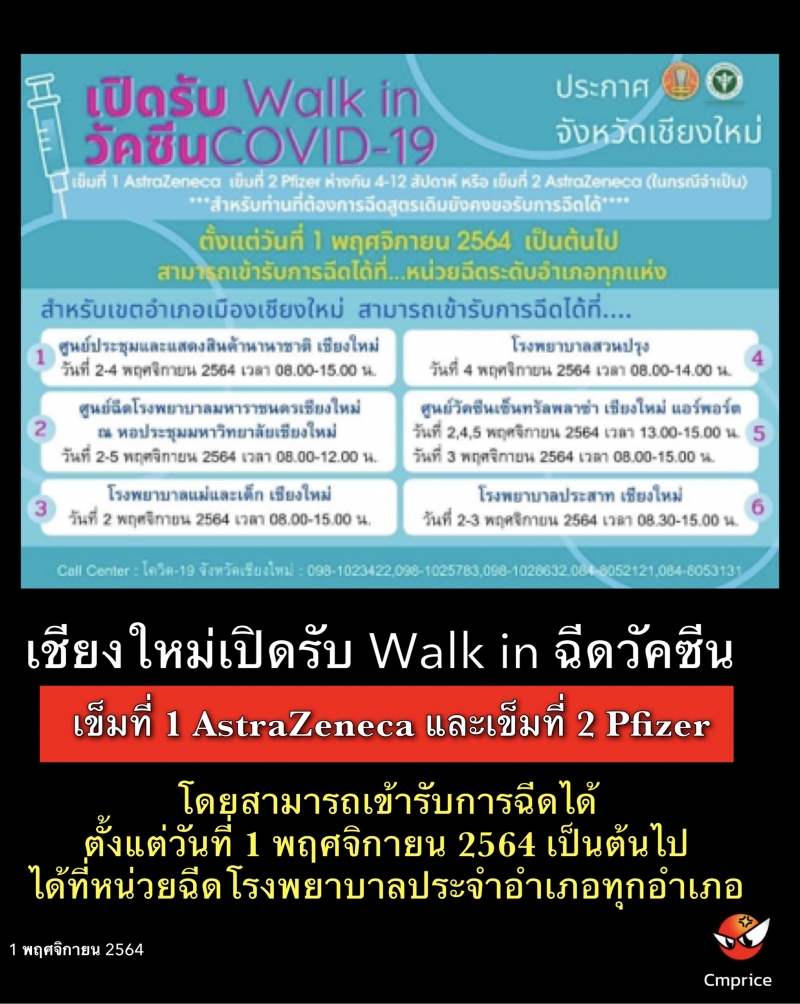 เปิดรับ Walk in ฉีดวัคซีน สำหรับผู้ที่มีอายุ 18 ปีขึ้นไป และมีภูมิลำเนาในจังหวัดเชียงใหม่