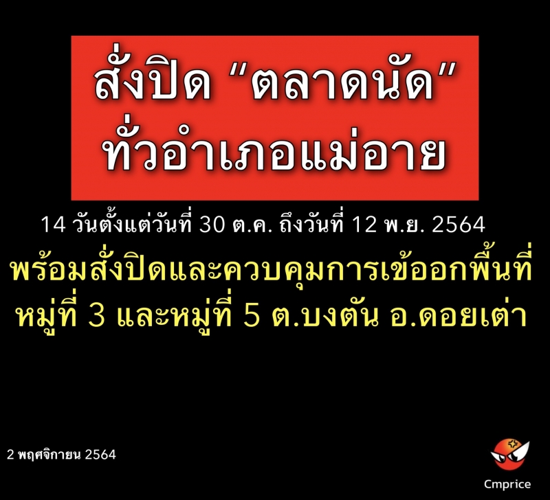 วันที่ 2 พ.ย. 64 คณะกรรมการโรคติดต่อจังหวัดเชียงใหม่มีมติให้ออกคำสั่งฯ ที่ 232/ 2564 เรื่อง ปิดสถานที่เสี่ยงเป็นการชั่วคราว โดยสั่งให้ ปิดตลาดนัดทุกแห่ง ในพื้นที่ อำเภอแม่อาย จังหวัดเชียงใหม่ เป็นระยะเวลา 14 วัน โดยให้มีผลตั้งแต่วันที่ 30 ตุลาคม ถึงวันที่ 12 พฤศจิกายน 2564 ทั้งนี้คำสั่งยังระบุอีกว่า หากครบ 14 วันตามคำสั่งให้ปิดแล้ว ให้เจ้าของตลาดนัดที่ประสงค์จะเปิดตลาดนัดใหม่ ให้ยื่นขออนุญาตในการเปิดทำการฯ ต่อ ศูนย์ปฏิบัติการควบคุมโรคอำเภอแม่อาย ก่อนเปิดทำการ 7 วัน หากศูนย์ปฏิบัติการควบคุมโรคอำเภอแม่อายได้พิจารณาและตรวจสอบแล้วเห็นว่า มีการดำเนินการตามมาตรการควบคุมโรคอย่างเหมาะสม จึงอนุญาตให้เปิดตลาดนัดได้ และให้ศูนย์ปฏิบัติการควบคุมโรคตำบลไปตรวจสอบในวันที่เปิดตลาดนัด ว่าได้มีการปฏิบัติตามมาตรการโดยถูกต้องครบถ้วนหรือไม่ และรายงานให้ศูนย์ปฏิบัติการควบคุมโรคอำเภอแม่อายทราบภายใน 1 วันทำการถัดไป