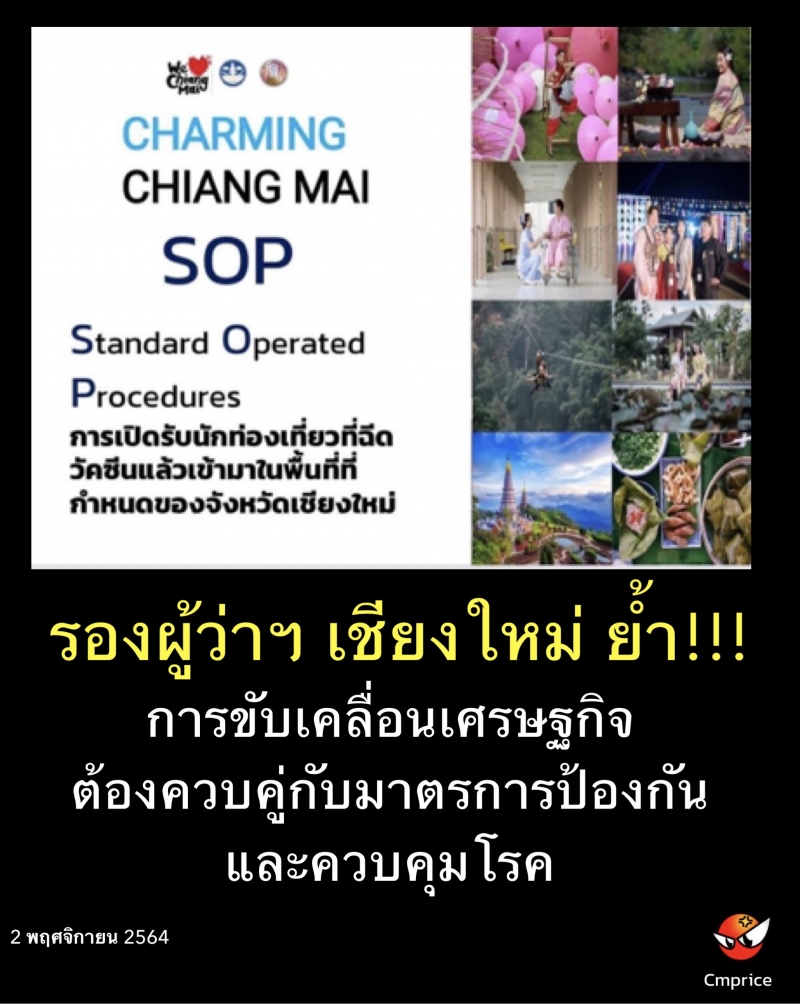 ทั้งนี้ รองผู้ว่าราชการจังหวัดเชียงใหม่ เน้นย้ำว่า การขับเคลื่อนเศรษฐกิจของจังหวัดเชียงใหม่นั้น จะต้องดำเนินไปควบคู่กับมาตรการป้องกันและควบคุมโรคเพื่อสร้างความปลอดภัยและความมั่นใจให้กับประชาชนชาวเชียงใหม่ด้วย
