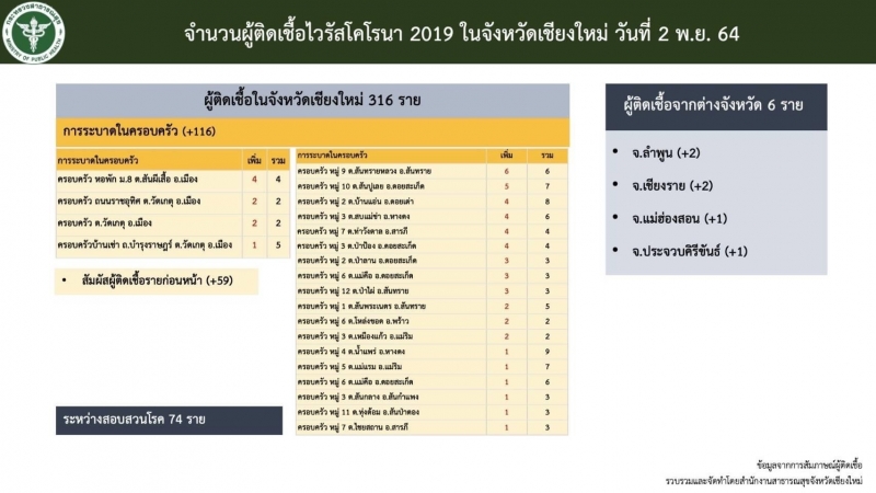 ทั้งนี้ขอแจ้งแก้ไขข่าวที่นำเสนอไปวานนี้ (1 พ.ย. 64) พบว่ามีความคลาดเคลื่อนจากการที่ผู้ติดเชื้อให้ข้อมูลเท็จว่ามีประวัติเกี่ยวข้องกับร้านก๋วยเตี๋ยวห้อยขา ริมปิง จากการสอบสวนแล้วพบว่าเป็นการติดเชื้อในครอบครัวที่ ตำบลยางเนิ้ง อำเภอสารภี ไม่ได้มีประวัติสัมผัสกับพนักงานร้านก๋วยเตี๋ยวดังกล่าวแต่อย่างใด