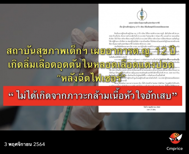 สถาบันสุขภาพเด็กฯ เผยอาการ ด.ญ. 12 ปี เกิดลิ่มเลือดอุดตันในหลอดเลือดแดงปอด หลังฉีดไฟเซอร์ “ ไม่ได้เกิดจากภาวะกล้ามเนื้อหัวใจอักเสบ”