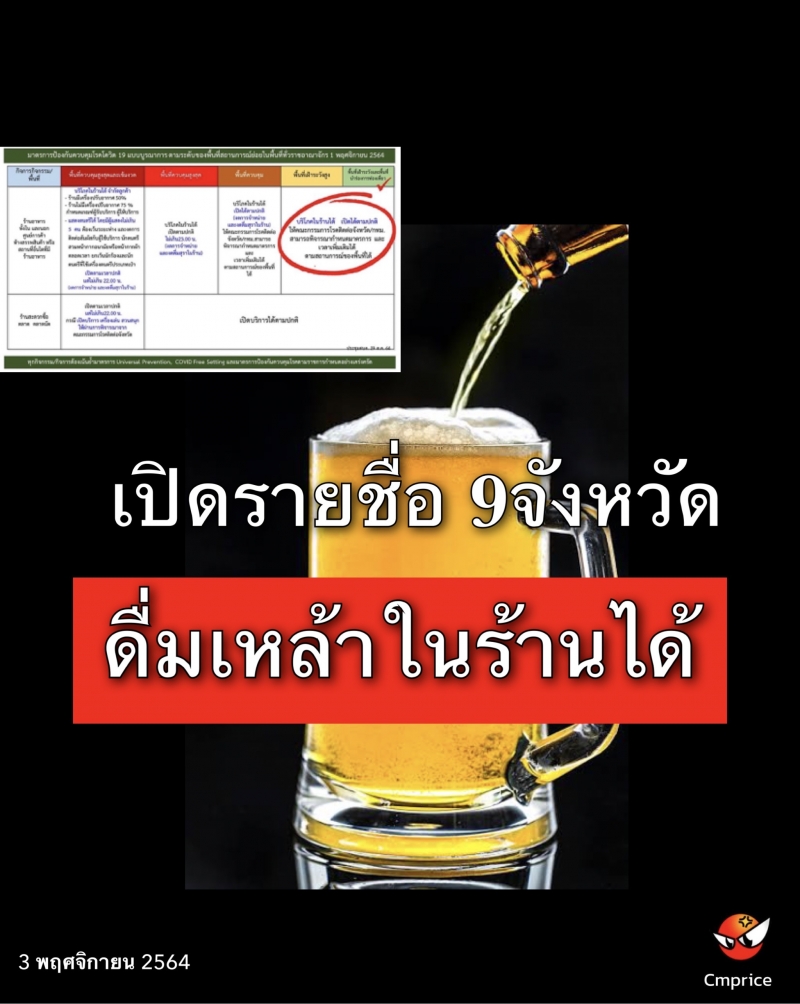 เมื่อวันที่ 3 พ.ย. 64  ศูนย์ข้อมูล COVID-19 ได้แถลงข่าวประจำวัน และในแถลงมี บางช่วงได้กล่าวว่า  "อนุญาตให้ดื่มแอลกอฮอล์ ในร้านอาหารได้" โดยให้ จังหวัดที่เป็น พื้นที่สีเหลือง/เขียว และ พื้นที่เฝ้าระวังสูงพื้นที่นําร่องท่องเที่ยว (พื้นที่สีฟ้า)  ยกเว้นเชียงใหม่   และต้องอิงประกาศของแต่ละจังหวัด